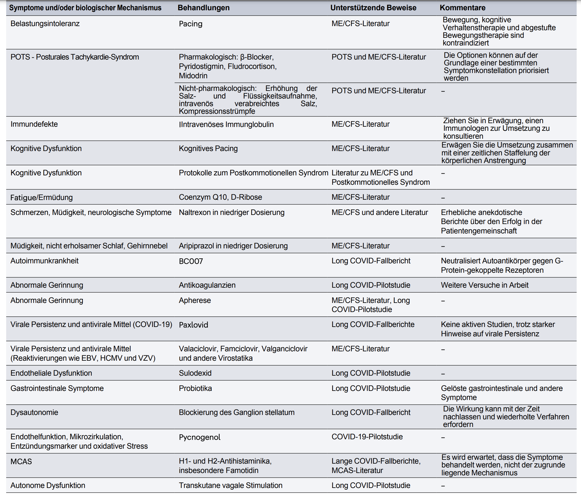 Insgesamt beruhen die derzeitigen Behandlungsmöglichkeiten auf kleinen Pilotstudien bei Long COVID oder auf dem, was sich bei anderen Krankheiten als wirksam erwiesen hat; mehrere zusätzliche Studien sind im Gange175. Es gibt eine breite Palette möglicher Behandlungsoptionen für ME/CFS, die verschiedene Mechanismen abdecken, darunter die Verbesserung der Funktion natürlicher Killerzellen, die Beseitigung von Autoantikörpern, Immunsuppressiva, antivirale Mittel gegen reaktivierte Herpesviren, Antioxidantien, Unterstützung der Mitochondrien und mitochondriale Energiegewinnung176,177; die meisten müssen klinisch erprobt werden, was dringend geschehen sollte. Viele neuere Behandlungsmöglichkeiten sind noch nicht ausreichend erforscht, darunter Antikoagulanzien und SARS-CoV-2-spezifische Virostatika, und die mangelnde Finanzierung stellt eine erhebliche Einschränkung für solide Studien dar.